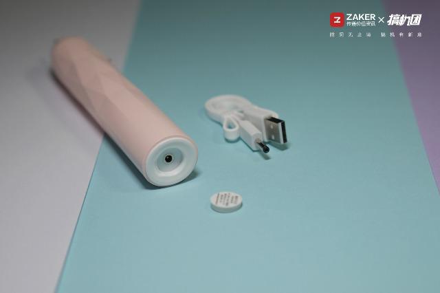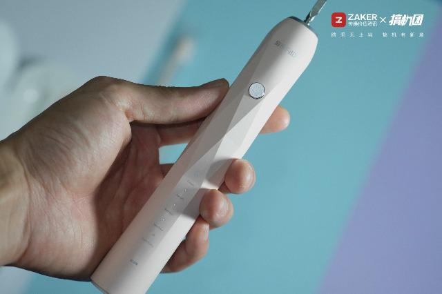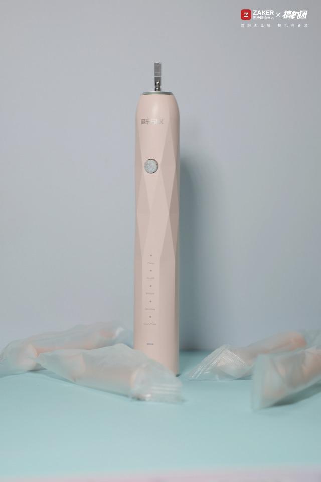牙刷的外觀為櫻花粉色,手柄上方處為鉆石切割工藝,應(yīng)該是作為握持防滑的處理吧,另外也顯得尤為高級。