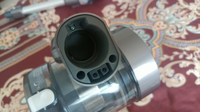 可以看到吸塵口在濾網中軸線上,濾網進風口在塵杯左側,這種外切線“龍卷風”一樣旋轉進風的方式可以有效保持高效吸塵。