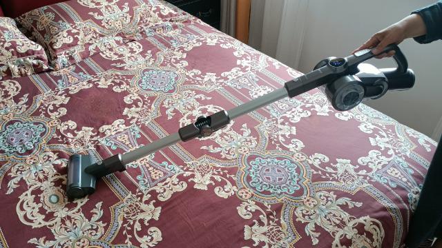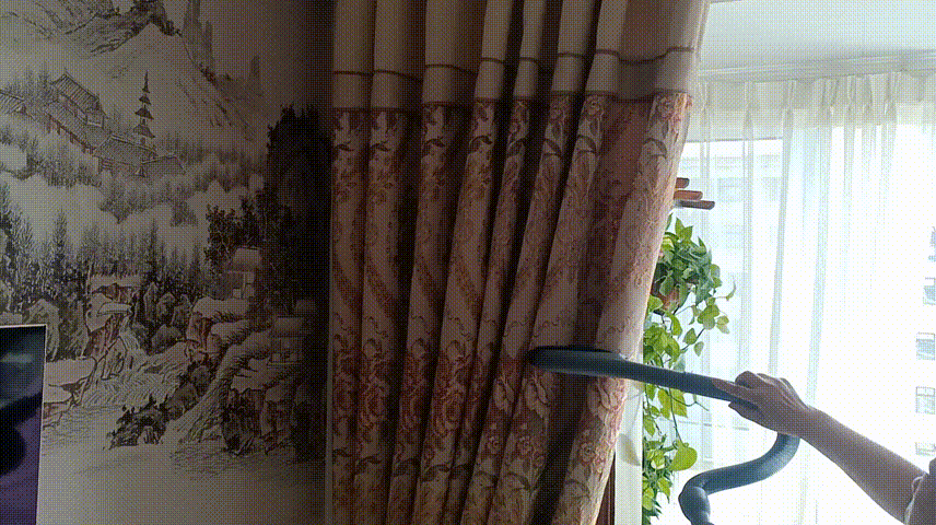 連接延長軟管清掃窗簾,可以明顯感覺到強大的吸力,軟毛刷清潔刺繡也不會損傷窗簾。
