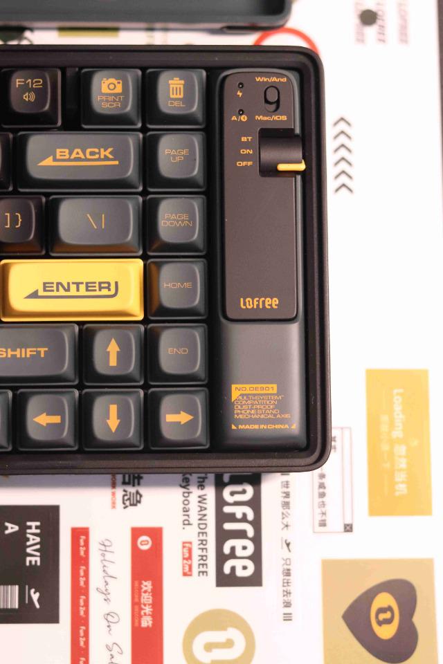 小浪鍵盤的右側是鍵盤的控制區,復古的滾輪控制鍵盤的開關以及藍牙,上下的滑動的撥片操作系統的選擇,以及電量藍牙指示燈等,當時用有線連接的時候會自動給鍵盤充電,電量指示燈會亮起,這次要給鍵線分離點個贊。底部還有這款鍵盤的編碼No.OE901,是這款鍵盤的編號不是這把鍵盤的編號。
