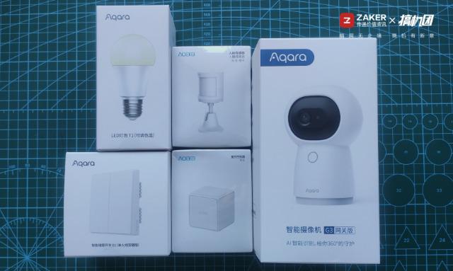 本次評測體驗的產品是由Zaker搞機團提供的Aqara Magic Anywhere套裝,其中包含Aqara智能攝像機G3、智能墻壁開關D1單火線雙鍵版、魔方控制器、人體傳感器和LED燈泡T1。套內產品均支持Zigbee協議,LED燈泡還支持藍牙協議。平臺方面全部產品支持Aqara APP,G3支持HomeKit不支持米家,魔方控制器支持米家不支持HomeKit,其余產品都支持。