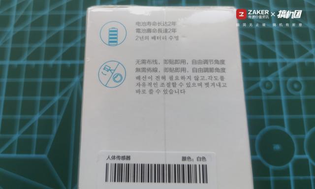 人體感應器配件包括一個圓形雙面貼和一個萬向軸支架,通過支架可以平放、粘貼或者是倒置安放。人體感應器最大探測角度為170°,探測最大距離7米。