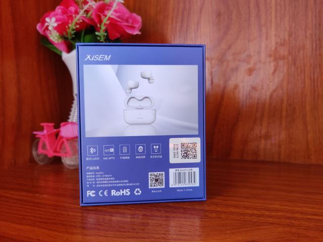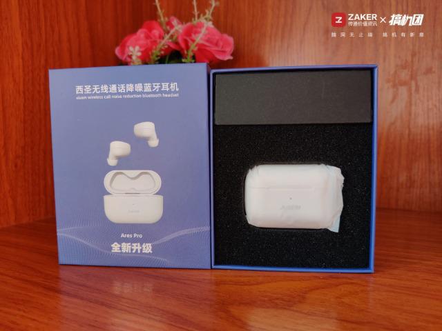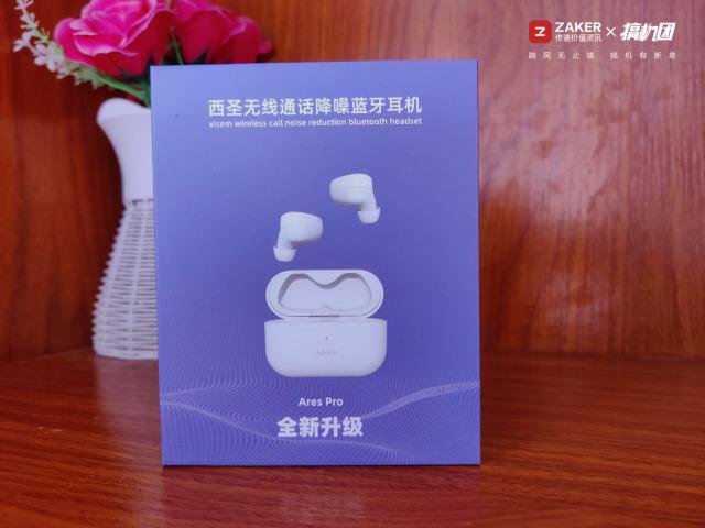 西圣Ares Pro的包裝整體采用大面積藍色,比較清新。整體非常的簡潔并且很小巧,非常環保。居中的西圣Ares Pro的產品定妝照,真無線通話降噪藍牙耳機,簡單易懂。