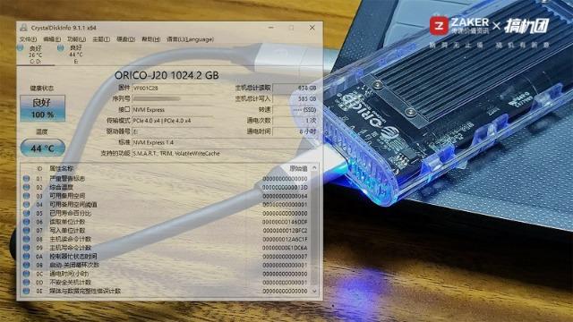 經(jīng)過一番頻繁的讀寫測試過后,打開CrystalDiskInfo來查看固態(tài)硬盤的參數(shù)信息,共計通電1次,穩(wěn)定運行8小時,其間讀寫測試數(shù)據(jù)接近600G上下,從讀寫數(shù)據(jù)的表現(xiàn)來看各方面都良好,臨近降溫天設(shè)備溫度保持在44度左右。