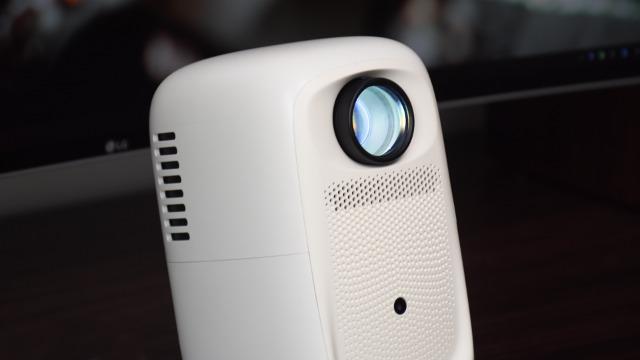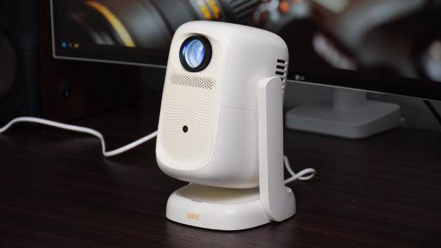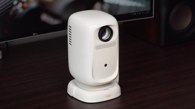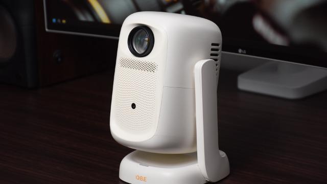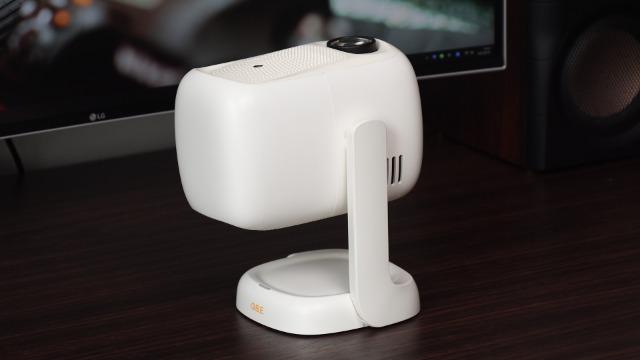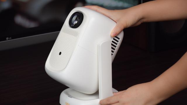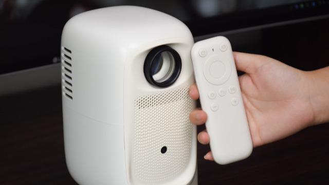 大眼橙C2 Air高亮版的外觀一改傳統投影儀那種工業感和科技范的調性,奶油白配色搭配圓潤的線條過度,顯得簡約又有親和力,尤其是女生更喜歡這種奶油風的調調。立式機身擺放不會占用太大的地方,隨便放在床頭柜角落就可以,非常適合空間局促的租房族。