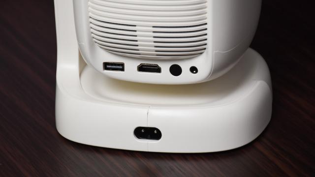 背部除了上方大面積散熱格柵之外,底部還有一排擴展接口,包含USB、HDMI、紅外接收器和3.5毫米音頻接口,擴展本地片源、連接電腦和外置音頻設備都沒問題。電源接口位于底座背部。