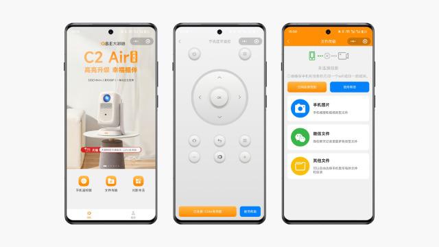 通過微信“大眼橙投屏助手”連接投影儀,不僅能當做遙控器操作投影儀,還能傳輸圖片、文件到投影儀進行投屏展示。